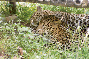 It’s hot: A pair of leopards rest under a makeshift shelter at the Dhauladhar Nature Park, Gopalpur, 35 km away from Dharamsala, on Monday.— Tribune photo