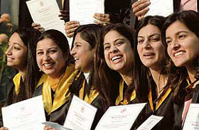 Girls pose with their degrees during the 28th convocation at Bharatiya Vidya Bhawan,
