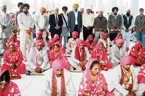 Newly weds being blessed by members of the Nishkam Sewa Ashram at Daad village in Ludhiana on Sunday.