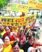 The BJP mahila morcha members protest against inflation in Amritsar. — A Tribune photograph