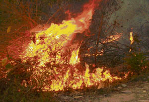 Fire rages in the Vehmova village forest area in Hoshiarpur district on Sunday night.