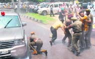 Former Zirakpur MC chief N.K. Sharma (right) shields BJP’s Navjot Singh Sidhu during a rally in Chandigarh on Monday.