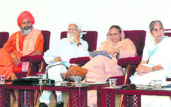 Baba Balbir Singh Seechewal (from left), Sunderlal Bahuguna, Bibi Inderjit Kaur, president, All-India Pingalwara Society and health minister Laxmi Kanta Chawla at a seminar on ecology in Guru Nanak Dev University, Amritsar, on Wednesday. Photo: Vishal Kumar