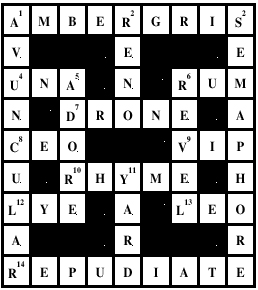 1. Substance secreted by whales used in perfume making 4. District town in Himachal Pradesh 6. Alcoholic liquor made from molasses 7. Pilot-less aircraft used in war, as now in Afghan-Pakistan area 8. Executive head of an organisation (inits.) 9. Person of high rank or importance (inits.) 10. Similarity in sound, especially in poetry 12. Strong chemical cleaner 13. Fifth sign of the zodiac 14. Deny, disown, or reject something Down 1. Helpful and friendly, resembling an uncle 2. Casino city in Nevada 3. Messaging system using hand-held flags 5. Love somebody deeply 6. Take great delight in something 11. An old unit of length