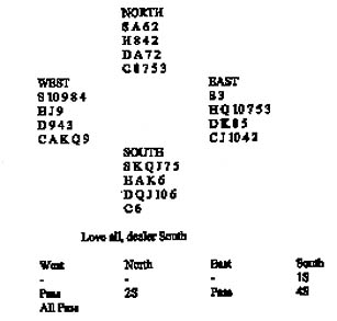Bridge WHY did North raise to 2S on his 3-3-3-4 shape? Was he playing a five-card major system? No, but he was playing a strong 1NT system on which his partner would open 1C on all weak no-trump hands. His partner would therefore hold either five spades or a balanced hand of at least 18 points. In the latter case, he would rebid 2NT. How would you play the spade game when West leads two top clubs and you ruff the second round? If you start by playing the ace and king of trumps you will lose control and go down. You should play just the king of trumps and then run the queen of diamonds. Suppose East wins with the diamond king and forces you with another club. You ruff and cash the queen of trumps, discovering that you now have fewer trumps than West. You cash the ace and king of hearts and play two more rounds of diamonds, everyone following. The fourth round of diamonds is ruffed with dummy’s bare ace and your jack of trumps will bring you a tenth trick. Suppose instead that East allows your diamond queen to win. The safest continuation is to play a diamond to the ace, ruff a club yourself, cash the top hearts and exit with a diamond. Again you will be able to ruff the fourth round of diamonds with dummy’s ace of trumps.