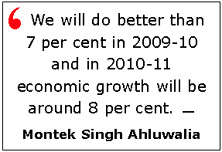 “We will do better than 7 per cent in 2009-10 and in 2010-11 economic growth will be around 8 per cent,” Planning Commission Deputy Chairman Montek Singh Ahluwalia said while speaking at the 104th annual session of the industry chamber PHDCCI. Commenting on the statement of Finance Minister Pranab Mukherjee that 9-10 per cent was “within reach”, Ahluwalia said: “I agree with him...we will get back to 9 per cent during 2011-12.” However, about the Commission's assessment of the economic growth, Ahluwalia said: “We would be able to tell you once we complete our mid-term appraisal of the XIth Five-Year Plan, which is likely to be completed by January. “India was growing by 9 per cent before the global financial crisis hit the world economy and pulled down the country’s growth rate to 6.7 per cent during 2008-09,”