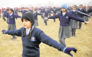 GEARING UP FOR R-DAY: Schoolchildren during parade rehearsal at Government College, Phase VI,