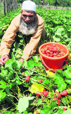 Wanihama, May 28 The success story of this progressive farmer started five years ago when he experimented with strawberry crop on one kanal. He never knew that temperate climate of the area would suit the crop and he would hit the jackpot. From one kanal in 2005 to eight kanal in 2010, Mir has become a role model for others in his Wanihama village as after taking his help around 40 families in the village have started growing the cash crop. Now, even the name of the village has been changed to strawberry village. “Prior to growing strawberry, I used to grow wheat which would only fetch me Rs 5,000 a year, but now with the same piece of land I am earning Rs 4 lakh per year,” says Mir. He says the success story has spread to around 200 kanals in the village as the majority of the villagers are growing strawberry. Mir is being frequently visited by various ministers, top bureaucrats, politicians and local residents who want to grow strawberry come to hive to get valuable tips. However, Mir, who was expecting a bumper crop this season, was disturbed to see that due to continuous rainfall for two months more than 60 per cent of his crop has been damaged. “The demand this year was good, but continuous rainfall for almost two months spoiled everything, the fruit which was almost ripe got damaged due to the moisture and we incurred losses of more than 60 percent,” rues Mir. But still Mir has not lost hope and feels that he would be able to produce around 10,000 kg of fruit this year. He has a message for farmers and wants them to take up growing strawberry as despite all odds its gives a good income. |