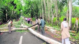 Dehradun, June 22 Today also several roadside trees got uprooted and cars were damaged as branches fell on these. Certain commuters had a narrow escape. As the dust storm started the wireless phone of the SP (City) continued to ring with the information of felling of trees on cars and roads in different parts of the state capital. The New Cantt Road, Rajpur Road, Survey of India and the Deer Park are a few of the places where roadside tress got uprooted, created a ruckus in the area.
