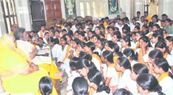 Chancellor of Dev Sanskriti University Pranav Pandya and Shail Jiji address students before their departure to 11 states for an internship course in Haridwar on Tuesday. Tribune photo: Rameshwar Gaur