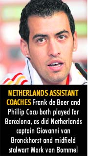 The emphasis on attack, the dominance of possession and the rapid passing moves that can rip open the best-organised defences are all characteristics that trace their roots to Cruyff's Barca 'Dream Team' of the early 1990s. "I can talk to you about Van Gaal and Cruyff, who brought important players through from the youth system," Busquets told a packed news conference at Spain's training base on Friday. "Rijkaard also pushed the 4-3-3 philosophy which is important for Barca and has also helped the national team," the 21-year-old added. The Barca-Dutch connection does not end there. Netherlands assistant coaches Frank de Boer and Phillip Cocu both played for Barcelona, as did Netherlands captain Giovanni van Bronckhorst and midfield stalwart Mark van Bommel. Spain defender Carlos Marchena told the news conference that having so many players from Barca, which he said was currently "the best team in the world", was a guarantee of success. — Reuters |