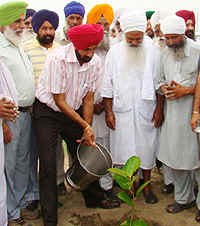 Deputy Commissioner Kahan Singh Pannu and envronmentalist Baba Sewa Singh plant a sapling at Bundala village on the Jandala-Tarn Taran road.