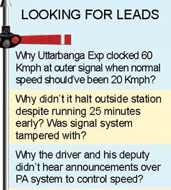 As Railway Minister Mamata Banerjee finds herself under the scanner for the increasing number of rail accidents, officials here said it would be hard to find answers to some basic questions, which have been thrown up after the accident. There have been as many as 16 train accidents in Mamata’s tenure as Railway Minister since July last and all the inquiries set up to go into the mishaps have not come up with much on as to how the tragedies could have been averted. Sources said a major question that would be difficult to answer is why had the Sealdah-bound Uttarbanga Express clocked an unexplainable 60kmph at the outer signal when the speed there should have been brought down to around 20 kmph? Officials say at 60kmph it would have been near impossible to stop at the station. While Mamata has hinted at “other reasons” behind the accident, officials point out that the Uttarbanga Express should have actually halted outside the station rather than entering the station at that speed. They also say that the train should have halted, as it was running 25 minutes ahead of its scheduled arrival time at Sainthia station. Railway authorities have also been left perplexed as to why the driver and the assistant driver of the Uttarbanga Express failed to heed frantic announcements being made over the loudspeakers to control the speed of the train. The Ranchi-bound Vananchal Express, which was running five hours late, had just begun to leave the Sainthia station. This means another train cannot come on the same line as the signal would have been red for an incoming train at the outer. The ‘home signal’ was not given, claimed Assistant Station Master Chakraborty. Officials are also trying to verify whether the signalling system had been tampered with. Even if the answer is yes, there are no answers available as to why the two trains were on the same line. Officials point out that on seeing the Uttarbanga Express coming at such a high speed, the assistant station master had reportedly used the loudspeakers at the station, asking the driver of the Uttarbanga to immediately apply brakes. But officials have no answer as to why there was no reaction from the driver or his assistant? Officials are trying to verify whether the driver and the assistant driver were sleeping or not fully conscious? But they also have the information that only a few minutes earlier, the driver of the Uttarbanga Express had correctly halted the train at the previous station. So how come he and his assistant went into a sudden sleep? Was Dey over-stressed? No, say railway officials. “Dey had an unblemished accident-free record and was promoted recently. Moreover, he had adequate rest before taking charge of the train at Malda station, five hours before the accident,” the official said. Prior to the accident, Dey had a conversation with the Railway Station staff at Rampurhat, which falls just ahead of Sainthia, and that showed that he was in absolute control of the train, ruling out the possibility of his being inebriated, the official said. In the past, judicial inquiries have been conducted into several train accidents. A CBI inquiry, however, was ordered into the recent Gyneshwari train accident near Jhargram in which 148 passenger were killed. In August, 1999, former Supreme Court judge G.N.Roy conducted a probe into the train collision at Ghainshal station near Siliguri in which some 250 passengers were killed. (With inputs from Subhrangshu Gupta)