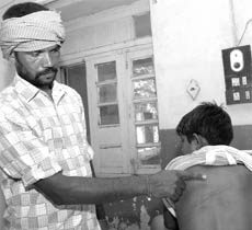 Gurjinder Singh, student of Class VIII, who was allegedly beaten up by a teacher in Government High School, under treatment at Civil Hospital,