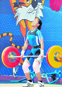 Debutant 18-year-old Augustine Nkem Nwakolo of Nigeria, not only dampened home country's plan of making a golden start in the weightlifting competition by setting all three new Games records but also pushed pre-competition favourites Sonya Chanu Ngangbam and Sandhya Rani Devi Atom to the second and third positions here this afternoon. Augustine Nkem Nwakolo cleared 77 kg in snatch and 98 kg in clean and jerk to romp home a comfortable winner with an aggregate of 175 kg, 10 kg more than the previous record. Though Sonya Chanu Ngangbam made a gallant attempt in trying to clear 103 in clean and jerk to overtake Augustine Nwakolo's total but it was too much for her. After failing to clear the asked weight in her last two attempts, she had to settle down for a silver, aggregating eight kilogram less than her African conqueror. Sandhya Rani Devi Atom and Zaira Zakaria of Malaysia had aggregated 165 kg each but since the home girl was lighter by 210 grams than her opponent, she got the bronze. Augustine Nkem Nwakolo not only set aside all previous Games record held by Indian star Kunjurani and set new records in snatch, clean and jerk and aggregate but also greeted her country's Sports Minister's arrival at the venue of the competition with a gold medal. In fact, supremacy of Augustine had become apparent in the snatch only as she cleared 77 kg while Sonya CVhanu failed with 76 kg in her last two attempts after starting with a clean lift of 73 kg. Zaura Zarkaria of Malaysia, too, was ahead of Sonya Chanu by clearing 75 kg in her third and last attempt. Sandhya Rani could not clear 73 kg and her best in snatch was 70 kg that put her at firth position. If she managed to get a bronze it was because of clean and jerk of 95 kg against 94 by Sonya Chanu. In the men's section, it was Aminul Hamizan Ibrahim of Malaysia who with a snatch of 116 kg and clean and jerk of 141 kg took the gold with an aggregate of 257 kg while India's Suken Dey with a snatch of 112 kg and clean and jerk of 140 kg finished five kilogram behind with an aggregate of 252 kg. In fact like Sonya, Suken Dey did try to equal, if not overtake his immediate rival's total, but the attempt proved futile, exactly the way it had happened to Sonya Chanu in the morning. India's second hope in the event VS Rao was a comfortable third with an aggregate of 246 kg, 107 kg in snatch and 141 kg in clean and jerk. For India, both bronze medallists - Sandhya Rani and Rao - cleared higher weights than their silver medal winning team mates.