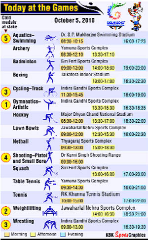Otherwise it was a mixed day for the home team as its tennis and squash players made impressive starts with swimmers putting up an inspired performance in the five gold medal events decided today. Australia has won four of eight medals on stake today while the remaining four have been shared by South Africa, Canada, Malaysia and Nigeria. Malaysia and Nigeria got it in weightlifting for men (6=56 kg) and women (48), Canada and South Africa got one each in aquatics. Australia won thre gold in aquatics besides the gymastics artistic team championhsip for men. With two silvers and as many bronze medals, home team appeared somewhat satisfied though it was expecting a dreamy golden start of its campaign in the 11-sporting extravaganza that got off to scintillating start after a glittering opening ceremony on Sunday.