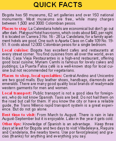 visits Bogota, the capital of Colombia. Once feared WHEN the cab driver turns around and addresses you as Mi amor, don’t feel hassled. This is how every gallant Spanish man addresses a lady he meets. And when he does so with the typical Latin American swagger, you know you are in the land of Garcia Marquez where some things are for real and others, magical. The capital of Colombia, Bogota, once feared as the capital of drug lords and crime, is now a tourist’s paradise. Some precautions are advised as they would be in many of the developing world cities: some areas are not safe like downtown after sunset, do not flag taxis which are not the yellow, with their numbers written all over them and don’t flaunt jewellery and expensive items when downtown.