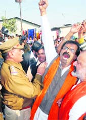 Activists of the Bajrang Dal raise slogans against the police after their arrest at Sector 52 in Chandigarh on Monday. Tribune photo: S Chandan |
