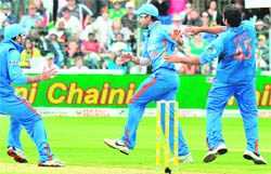Paceman Ashish Nehra provided the breakthrough when he got the prized scalp of Smith (18). The South African captain went down the track and flat batted it towards mid-off where Harbhajan Singh took a brilliant catch. Amla continued to play aggressively at the other end and notched up his half century with a boundary off the bowling of part-timer Yuvraj Singh. The complexion of the game changed dramatically after that as the hosts slumped to 118 for five as Amla (65), Morne van Wyk (15), A B de Villiers (3) and Faf du Plassis (1) perished in quick succession. — PTI