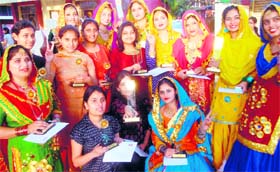 Students in a jubilant mood after receiving prizes at the annual function of MCM College for Women in Sector 36, Chandigarh. Tribune photo: Vinay Malik |