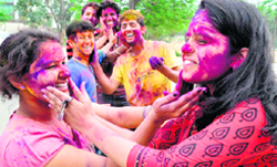 AFFECTION: Students play Holi in Sector 10, Chandigarh, on Saturday. Photo: Parvesh Chauhan