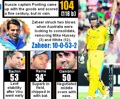When the batting Powerplay was taken in the 45th over, India needed 22 runs from 30 balls for victory with Yuvraj Singh on 52 and Raina on 19. Raina hoisted the first ball off Brett Lee over the long-on fence for a huge six to ease the pressure somewhat. And in the next over, when left-arm pacer Mitchell Johnson bounced one at Raina, he carted it to the ropes and thereafter, it was a steady ride to the target with Yuvraj applying the knockout punch with a searing boundary. An Indian victory looked imminent when 14 runs were scored off Lee in the 40th over though what mattered most was the steely nerves displayed by Yuvraj and Raina, who found the gaps to score runs, in the crunch. They drove the Aussies to desperation, which led to many goof ups in the field and comic gaffes. But at one stage, India looked like succumbing to self-inflicted wounds when Gautam Gambhir committed virtual harakiri to be run out. Yuvraj too was lucky to escape a run out though captain Mahender Singh Dhoni could not last long. When Dhoni departed, India's victory chances looked bleak, but Yuvraj and Raina showed that cricket was a game of grit by stealing cheeky singles and twos, and smashing boundaries to blunt the four-pronged pace attack of the Aussies. While India relied on spin to restrict Australia to 260, despite captain Ricky Ponting's century, Australia's pace battery could not achieve the desired result in the face of concerted assaults, first by Sachin Tendulkar, and then by Yuvraj and Raina. Yuvraj also completed 8,000 runs in ODIs while Sachin surpassed the 18000-run land mark. It was Yuvraj's 29th half century in ODIs, seventh of the World Cup, fourth against Australia and fourth in this edition of the World Cup. India thus avenged their defeat at the hands of Australia in the final of the 2003 World Cup and now take on Pakistan in the semifinal at Mohali. Though "God of Cricket" Sachin Tendulkar's date with 100 international centuries got postponed for another day, he did cross a couple of milestones before being out for 53, caught behind by wicket-keeper Brad Haddin, off Shaun Tait. His knock was embellished with seven boundaries. Normally Sehwag starts the day with a four, but this time Sehwag missed that honour, but Sachin did it, with two fours off Shaun Tait. India started the chase on a shaky note as Virender Sehwag was lucky to survive a caught behind appeal in the very first over off Brett Lee, though as is his wont, he finally exited after cracking two pleasing boundaries.