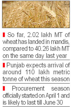 A combination of cloudy weather, mild hailstorm, and gusty winds, which swept entire Punjab on Friday night and Saturday evening, instilled a fear psychosis among farmers, though no major damage has been reported to the crop so far. "No damage to wheat has been reported from any of the mandis. There are no reports of any discolouration either," said DS Grewal, Punjab Food and Civil Supplies secretary. Farm expert Naresh Gulati said lodging would cause discolouration of grains only in case wheat crop gained excess moisture. "It will force farmers to resort to manual harvesting of the crop in lodging affected patches. Farmers should harvest their crops only after grains turn dry," he said. The sudden and unexpected decline in the arrival of wheat could be gauged from the fact that just around 2.02 lakh metric tonne of the crop had landed in Punjab mandis till Friday evening as compared to a whopping 40.26 lakh metric tonne on the same day last year. The Punjab Food and Civil Supplies department authorities are worried that the delay in the onset of arrival by about a fortnight could make things difficult for them as they would be left with lesser time to lift the crop from markets. Officially, the wheat procurement season started from April 1 and would last till June 30. But procurement usually gets over by May 15 due to sudden glut-like rush of grains in mandis during this period. Punjab was expecting arrival of around 110 lakh metric tonne of wheat in mandis this time. The Food and Civil Supplies' statistics revealed that Punsup had topped the list of government procurement agencies by procuring 56,827 metric tonne by Friday evening. It was followed by Punjab Markfed (46,716 MT), Punjab Agro (38,205 MT), FCI (20,606 MT), Pungrain (20,474 MT) and Punjab Warehousing Corporation (17,599 MT). |