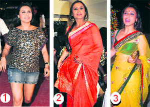 1. Blingy It is a nice top and so are the black boots but the skirt is meant for girls half her age. She should have worn dark blue denims and would have looked a killer! Rani loves sarees and she loves orange. It matches her sunny disposition. What is better than a cotton saree to wear in the summer? She looks gorgeous and we love the braid. 3. Colourful The Bong bombshell is in an ebullient mood. We love the riot of colours and the net sari makes her look very sexy. The bindi is such a nice touch. 4. Grey area We like her attempt at a corporate look. We like the shirt, vest, and black pumps but the striped pants are outdated. Her eye make-up is stunning. —HRM |
