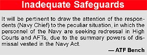 “It will be pertinent to draw the attention of the respondents (Navy Chief) to the peculiar situation, in which the personnel of the Navy are seeking redressal in High Courts and AFTs, due to the summary powers of dismissal vested in the Navy Act,” said the Tribunal’s bench, comprising Justice AC Arumugaperumal Adityan and Lt Gen S Pattabhiraman. Disposing of a writ pursued by the widow of a sailor who was dismissed by a summary court martial for allegedly falsifying official documents, the Tribunal set aside the punishment and ruled out that her husband would be deemed to have retired from service and that she would be entitled to family pension from the date of her husband’s death. The Tribunal held the summary trial to be vitiated since it was against the principles of natural justice. The sailor was dismissed from service in May 2000 and sentenced to 90 days rigorous imprisonment besides reduction in rank. He died in November 2010 during the pendency of the writ filed by him earlier. He had contended that he had not been given adequate opportunity to defend himself during his summary trial. The Tribunal also directed the Navy Chief to consider incorporation of suitable measures to make the provisions of Regulations 27 and 29 of the Regulations for the Navy, Part -II (Statutory) to be in conformity with the safeguards as built into the corresponding provisions of the Air Force and the Army Acts, since the summary disposal powers of dismissal cannot be treated as an admonition. |