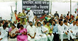 New Delhi, June 6 The BJP said that yesterday's situation at Ramlila Grounds was like undeclared emergency in which fundamental rights of citizens were crushed. Ramdev's movement was very democratic and the police action against him and his followers was unconstitutional and in barbaric manner. The BJP activists tied black strips observing black day and staged a satyagraha for 24 hours at Rajghat. Senior BJP leaders LK Advani, party national president Nitin Gadkari, Leader of the Oppositon in Lok Sabha Sushma Swaraj, Leader of the Oppositon in Rajya Sabha Arun Jaitely, party former national president Raj Nath Singh, Ananth Kumar, Vijay Goel, Vijender Gupta, Subhasha Chopra and other party leaders sat for satyagraha at Rajghat for the whole night since yesterday evening. They were singing nationalistic songs and taking vow to dislodge the Congress government. A delegation under the leadership LK Advani, Gadkari, Jaitly and Sushma Swaraj met the President demanding for special session of Parliament for discussing the issue of Ramdev, inquiry into the police action against Ramdev and his followers and re-establishing the Constitutional rights of the people. Addressing the satyagraha at Rajghat, Gadkari said the BJP considered that protecting the Constitution, the country, saints and protecting the human rights was party's sacred duty. Today's satyagraha was the first phase in a symbolic manner. The BJP would fight against the atrocities of the police, corruption of the Congress and on the issue of black money from Parliament Streets. India is not the ancestral property of the Congress that any government could act in a barbarous manner on the innocent satyagrahis, he said. |