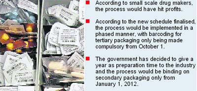 According to the new schedule finalised by the Ministry, the process would be implemented in a phased manner, with barcoding for tertiary packaging only being made compulsory from October 1, 2011. The government has decided to give a year as preparation time to the industry and the process would be binding on secondary packaging only from January 1, 2012. A notification in this regard will be issued soon by the Director General of Foreign Trade, (DGFT) sources said. According to small scale drug makers, the process would have hit profits. Moreover, the intended purpose- preventing exports of fake drugs- was unlikely to be achieved, industrialists said. Even now, most unit owners said the move would lead to slowdown in export of generic drugs due to the extra expense involved. The industry has also maintained that barcoding is used by multi-nationals to control inventories, because MRP varies in countries. It serves no purpose for pharma SMEs. It leads to export increase overheads, which get loaded on the export price and adversely affects competitiveness vis-à-vis the MNCs. The Ministry has also decided to relax the proposed 2D barcoding and unique ‘randomly generic numeric code’ packaging after consultations with the stakeholders. The Ministry has agreed to relax other norms to help exporters. The government is also considering allowing manual coding. |