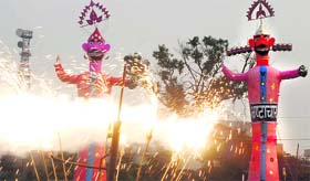 Jalandhar, October 6 By as early as half past three, people had gathered outside houses in streets and squares watching kids burning effigies of single-headed Ravanas with triangles for a body. In the high-profile venues, however, huge effigies of Ravana, his brother kumbhkaran and son Meghnath, as much as 50 to 65 feet in height, were burnt. Sophisticated shows with hit-tech effigy-burning ceremonies were held as thousands (at places lakhs) of people outside and inside the barricades, perched on buildings, houses, trees, tanks, barricades and each others’ shoulders view the grand fiasco. Out of the 40 “official” Dasehra extravaganzas, 26 prominent ones were those held at the Burlton Park, Saindass School, Master Tara Singh Nagar, Adarsh Nagar, Guru Gobind Singh Stadium, Pathankot Bypass Chowk, Choti Baradari Chowk, etc, while 14 were not so grand. Three to five were held in the bastis alone. Earlier in the day, shobha yatras from various temples to Dasehra venues were taken out, which kept the roads, especially in the city bazaars, clogged. Most yatras started at 2 pm or later and reached the venues by 4 to 4.30 pm, after which the Dasehra ceremonies began. As lakhs of people were out at various venues to view Dasehra celebrations, the police also had elaborate arrangements in place. As many as 900 police personnel were deputed to ensure proper security at various venues. Important places of Dasehra celebrations: Burlton Park Oldest in town, Dasehra is being celebrated for the past 133 years. President of its Dasehra committee Ranjkumar Gupta, former Congress MLA, says people of the area have emotional associations with it. Shobha yatra: Nauhriyan Mandir to venue USP: 60-foot effigies of Ravana, Meghnath and Kumbhakaran, signifying corruption, were burnt. Crowd: One lakh Adarsh Nagar The Upkar Dasehra Committee is 31 years’ old in the area ground. Chief organiser Advocate Brajesh Chopra has some interesting tech innovations up his sleeve. Shobha yatra: Siddh Baba Balaknath Mandir to the venue USP: Remote-controlled effigies of Ravana and his brother and son were set on fire from a distance. Nothing manual. A Rajasthani folk dance troupe regaled audience. Ornamental electronic laris (chain lights) decorated the Ravana’s effigy. A vanar sena fight display also preceded the burning. Crowd: 20,000 plus scores of Adarsh Nagar housetop and treetop viewers Avtar Nagar Held at Partap Bagh earlier, Dasehra is being celebrated here by the Mahanagar Dasehra Committee for the past five years. Committee president Naresh Thatai said this year the effigy of the Ravana burned at the Government Training College ground stood for corruption. Shobha yatra: Chinnmastika Dham Mandir to venue USP: A magnificent golden Lanka decorated with golden paper and various goodies was burnt as Sita is rescued by Hanuman from the Ashok Vatika. Real fruits - apples, pears, grapes and bananas - hung on fake trees were hurled onto the crowds as Dasehra prasad. The show was on for half an hour. Drinks and snacks came free with the 700 to 800 VIP passes distributed on the occasion. Right before being burnt, the eyes of the Ravana’s effigy - which had the word corruption pasted across its front - emitted sparks that went about 10 feet in distance. Crowd: 25,000 plus Saindass School ground Being celebrated for the last 22 years, it is a grand affair even in the heart of a residential area in JP Nagar, says chief organiser Tarsem Kapur. Shobha yatra: Nauhriyan Mandir to venue USP: 60 feet Ravana’s effigy with glowing eyes. An elaborate show before the burning of the effigy. Pravachan (discourse) by Ravana follows sparks being emitted from his, Meghnath and Kumbhkaran’s eyes and mouth. Crowd: 20,000 police arrangement There were 40 Dasehra venues for which 40 nakas were set up and 40 patrolling teams were put on duty. Sniffer dog and anti-sabotage panels were also been set up. All our SHOs and ACPs were on the job today. The police also held two flag marches in the city in the morning. — Navjot Singh Mahal, ADCP (HQ) Quiet Dasehra