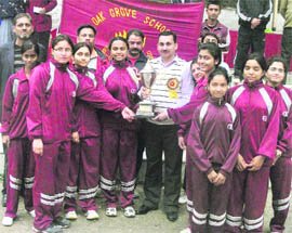 Oak Grove School girls with the winning trophy of the inter-school athletics meet in Mussoorie on Thursday. A Tribune photograph