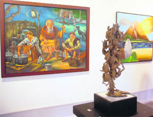 The Creators have their works displayed at the Government Museum & Art Gallery-10, Chandigarh. Together since 1981, this group comprises eminent painters, sculptors and applied artists from the region. The exhibition opens with some marvellous sculpture models by celebrated artist Shiv Singh. Black, bronze and silver - metal takes varied shapes and colours to signify books, the airport, open spaces and communication. Roop Chand, the pioneer of modern movement of art, has some works from his Bindu collection on display. The 'dot', signifying the beginning of life in its myriad forms, is the theme of his oil on canvas paintings.