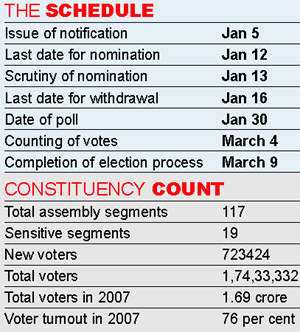 Chandigarh, December 24 Following the imposition of the code, as many as 27 companies of paramilitary forces have been deployed in the state to keep a vigil and ensure fair and peaceful polls. These forces will keep tabs on carrying of cash, liquor and narcotics by putting up nakas at different places. This was announced today by the Chief Electoral Officer, Punjab, Kusumjit Sidhu. She said in all, 200 companies of Central forces would be deployed in the state for the elections. Sidhu said 130 observers would also be deployed and they would include general officials as well as police officials from other states. It is the first time that IPS officials have been appointed as observers. The teams will be authorised to search the vehicles for cash, liquor or drugs, if any, upon suspicion or a tip-off. Passenger as well as goods vehicles will be liable to be searched. In case any cash/jewellery of value above Rs 1 lakh is found and the person is unable to explain it's source, it will be liable to be seized and handed over to the income tax authorities. Banks have also been instructed to report all suspicious cash transactions above Rs 1 lakh from any account and these shall be monitored by the Election Department as well as the Income Tax Department. The baggage of all persons traveling by chartered helicopters and aircrafts shall be checked before take off and at disembarking. The final voter lists would be published throughout the state on January 2 and those persons whose names are not included in the lists may contact their local booth-level officer, or the office of the Electoral Registration Officer, under whose jurisdiction their area of residence falls. A 24X7 complaint-cum-call centre has been set up in the office of the Chief Electoral Officer. Toll-free number 1950 has been obtained. Election Commission directions n