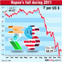 New Delhi, December 28 In addition, the rupee fell to historic lows against the US dollar, hitting the country's import bill. The bellwether indices of the Bombay Stock Exchange as well as the National Stock Exchange fell by over 26 per cent during the course of the year, touching new lows. The 30-scrip BSE Sensex was down by 5,334.01 points, or over 26%, at 15.175.08 on December 20, against last year's close of 20,509.09. Similarly, the 50-share Nifty witnessed a hefty fall of 1,590.30 points, or 25.92%, to 4,544.20 on December 20 from last year's close. There has been some recovery since then, with the Sensex closing at 15,873.95 and the Nifty at 4,750.50 on Tuesday, but market experts say investors remain cautious on India. Globally, the deepening European debt crisis and a historic downgrade of US creditworthiness hit the economic growth sentiment. Besides, political turmoil in the Middle East pushed up global crude oil prices, adding to inflationary pressures and pushing up the country's import bill. FIIs, the main drivers of the market, turned negative on Indian equities this year and after having injected a record Rs 1,33,266 crore, or over $29.36 billion, in 2010, pulled out Rs 2,497.50 crore, or $318.00 million, from equities till December 19.