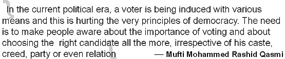 and sundry. Now other Muslim clerics from many parts of the district are coming forward to join his mission. Emphasis is also on urging people to join politics not for the sake of power and other benefits but for the purpose of serving society. Voting for a wrong persons at the base level would mean giving him a chance to contest elections of higher level, like that of Chief Ministers and legislators. References from holy Quran, Mishkat Sharif, Bukhari Sharif, the compilation of Hadiths are being related to, so as to make voters aware of the malpractices opted by a majority of politicians these days to garner votes. The efforts of the Muslim clerics have gained tremendous praise and admiration in the district. Even district election administration has acknowledged the voting awareness-drive being generated by them, which does not violate election code