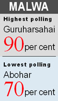 Ajnala seat saw the highest polling percentage at 80 per cent cpmpared to 76 per cent last time, followed by Gurdaspur with 78 per cent (73.52 per cent last time), Baba Bakala 79 per cent (new seat), Khadoor Sahib 78 per cent (68.21 per cent last time), Raja Sansi 77 per cent (almost same as last time), Sri Hargobindpur 76 per cent (77.23 per cent last time), Khem Karan 76 per cent (new seat), Dera Baba Nanak 75 per cent (new seat), Attari 75 per cent (65.24 per cent last time), Fatehgarh Churian 75 per cent (83.96 per cent last time), Sujanpur 74 per cent (76.75 per cent last time), Tarn Taran 74 per cent (65.69 per cent last time), Jandiala 73 per cent (69.84 per cent last time), Pathankot 72.6 per cent (73.53 per cent last time), Dinanagar 70 per cent (72.55 per cent last time), Bhoa 69.6 per cent (new seat), Qadian 68 per cent (77.52 per cent last time), Batala 67 per cent (72.67 per cent last time), Amritsar North 66 per cent (63.5 per cent last time), Amritsar Central 65 per cent (67.07 per cent last time), and Amritsar South 63 per cent (almost same as last time). The lowest polling was reported from Amritsar West at 56 per cent. In 2007 also this constituency had recorded the lowest pollest polling in Majha at 55.88 per cent. In Patti, where CM’s son-in-law and Civil Supplies Minister Adesh Pratap Singh Kairon is hoping to make it fourth time in a row, 77 per cent polling was reported as against 74.37 per cent last time. In Majitha, where Deputy CM’s brother-in-law and Youth Akali Dal Chief Bikram Singh Majithia is pitted against Congress’ Shailenderjit Singh Shally, 75 per cent polling was recorded as compared to 72.92 per cent last time. The newly carved out Amritsar East, where BJP MP Navjot Sidhu’s wife is pitted against former Mayor Sunil Datti, 68 per cent polling was recorded. The polling began on an enthusiastic note with spirited voters queuing up outside the polling booths soon after 8 am, particularly in rural constituencies. However, in the posh areas of Amritsar, polling gained momentum around afternoon. A number of exuberant young voters said: “The rot runs deep into our system. It is time that the younger generation takes charge and ushers in change.” Women voters from all sections turned out in large numbers to vote. SKIRMISHES: Two minor clashes were reported during the day in Amritsar Central. A scuffle broke out between supporters of Congress candidate OP Soni and an Independent councillor, a BJP supporter, over a trivial issue and the two groups threw stones at one another. In the second incident, a man, whose voting right was challenged by polling agents of both the Congress and the BJP, called his supporters and created a ruckus outside a polling booth in Tunda Talab. mla booked: Sitting SAD MLA from Ajnala Amarpal Singh Bony was booked under Sections 341,342 and 34-35 IPC for allegedly manhandling a mediaperson. Amritsar SSP Surinder Pal Singh Parmar said Bony had been booked for manhandling Sukhdev Singh covering the elections with due permission of the Election Commission when the incident occurred. In Tarn Taran district, there were three minor skirmishes in Khadoor Sahib. In Sangha village, SAD and Congress workers clashed after Akali sarpanch Resham Singh objected to the Congress activists’ helping a physically challenged person to cast his vote. In the scuffle, Resham Singh’s turban fell and the two sides threw stones at one another. The poll process was disrupted for a while before SAD candidate Ranjit Singh Brahmpura and Congress candidate Ramanjit Singh Sikki reached the spot and pacified their supporters. Minor clashes were also reported from Chamba Kalan and Gagarwal villages. In Ward No. 15 of Tarn Taran, councillor Sarabjit Singh was allegedly thrashed by some Congress supporters for “undue interference” in the poll process. In Nike Ghuman village, which falls in the Dera Baba Nanak segment, Congress candidate Sukhjinder Randhawa had to ask his followers to leave the moment his opponent Agriculture Minister Sucha Singh Langah reached there with scores of supporters. In Fatehgarh Churian, there was tension at a polling booth. Instances of EVMs developing technical snags also came to light. The EVM at Booth No. 102 in Tarn Taran and at Booth No. 127 at Khadoor Sahib had to be replaced folloing a snag.