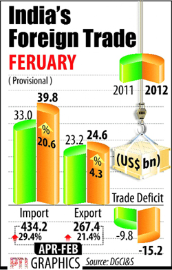 Merchandise exports grew an annual 4.3% to $24.6 billion in February, while imports grew 20.6 percent to $39.8 billion, trade secretary Rahul Khullar said Friday, citing provisional trade data. The trade deficit widened to $15.2 billion during the month, from $14.8 billion in January. With exports struggling to maintain the growth rate seen between April and September, Khullar revised up trade deficit projection for the fiscal year ending on March 31 to $175 to $180 billion from an earlier estimate of $160 billion. "Over the last five months...there has been a very large ballooning of the balance of trade deficit," he said. The trade deficit was $104 billion in the last fiscal year. India’s exports reached $267.4 billion between April and February — compared with the full-year target of $300 billion. — Reuters |