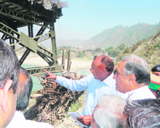 Uttarakhand Chief Minister Vijay Bahuguna examines the collapsed bridge at Chauras near Srinagar on Sunday.