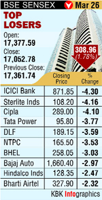 Analysts at Motilal Oswal Securities said the new GAAR is expected to effect from April 1. The new norms may become a major setback for FII inflows into the Indian market. The reason is India’s income tax department will have the power to deny individuals and entities the benefits of any tax avoidance treaty. FIIs are worried the government could raise tax demands as a result of these new provisions. Market experts warn fresh P-note issuance could be hit badly from April 1 until there is clarity from the government on the matter. Analysts at Enam said the undercurrent was subdued as most Asian markets struggled for direction today. European benchmarks also declined in a choppy session as an encouraging report on German business confidence was offset by worries over the state of the Spanish economy. In the currency market, the rupee erased early gains and fell to its lowest in more than two months of 51.35, pressured by oil payments and subdued shares. Market breadth was quite negative with 961 advances for 1890 declines of stocks. Dipen Shah, head of fundamental research, Kotak Securities said the markets opened lower today morning and continued to grind lower throughout the day. There were concerns on taxability of the income of FIIs operating out of Mauritius and also of those operating through P-notes. However, there is no clarity as yet on the final implications of the new norms. Stocks across sectors fell and the year-end considerations and the F&O expiry on Thursday also lent some degree of weakness to the markets, Shah said. |
