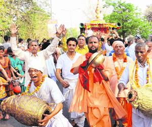 Devotees take part in Jagannath rath yatra organised by Sree Chaitanya Gaudiya Muth at Sector 20 in Chandigarh