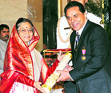New Delhi, April 4 Miranda's son Rahul received the Padma Vibhushan from Patil at a ceremony at the Rashtrapati Bhawan, which was attended by Vice President Hamid Ansari, Prime Minister Manmohan Singh, UPA chairperson Sonia Gandhi and a host of other dignitaries. A loud round of applause reverberated in the majestic Durbar Hall when filmstar Dharmendra stepped forward to receive the Padma Bhushan award from the President. Shutterbugs had a field day as actor-turned-activist Shabana Azmi received the Padma Bhushan. Among the Padma Bhushan awardees were literary theorist Homi K Bhabha, violinist MS Gopalakrishnan, Tata Steel vice chairman B Muthuraman, former bureaucrat Mata Prasad, mathematician Raghunathan, jurist P Chandrasekhara Rao, Vittal, neurologist Noshir Hormusji Wadia and former Singapore Foreign Minister George Yong-Boon Yeo. Eminent painter KG Subramanyan (Padma Vibushan), Satya Narayan Goenka and Jose Pereira (Padma Bhushan) were not present at the ceremony. Among the Padma Shri awardees were industrialist Swati Piramal, eminent diabetologist V Mohan, former hockey Olympian Zaffar Iqbal, archer Limba Ram and cricket commentator of yesteryear Ravi Chaturvedi. Yakshagana exponent Ramachandra Subraya Hegde Chittani, sitar maestro Shahid Parvez Khan, terracotta artist Mohan Lal Kumhar, Rajasthani folk musician Sakar Khan Manganiar also received the Padma Shri. Odissi dancer Minati Mishra, theatre personality R Nagarathnamma, Lavani exponent Yamunabai Waikar and Chhau dancer Gopal Prasad Dubey Art also received the Padma Shri. Among the other Padma Shri awardees were Laila Tyabji (handicrafts), Vijay Sharma (painting), Reeta Devi, Niranjan Pranshankar Pandya, Sat Paul Varma and Phoolbasan Bai Yadav (social work). Scientists V Adimurthy, Virander Singh Chauhan, Vijaipal Singh, YS Rajan and Jagdish Shukla were among the Padma Shri awardees. Distinguished chartered accountant Yezdi Hirji Malegam, industrialists Gopinath Pillai and Swati A Piramal, archaeologist K Paddayya and environmentalist Kartikeya V Sarabhai received the Padma Shri. Prof Mahdi Hasan, Shrinivas S Vaishya and Vallalarpuram Sennimalai Natarajan received the Padma Shri in the medicine category. The Padma Shri conferees in the Literature and Education category were Eberhard Fischer, Surjit Singh Patar, Irwin Allan Sealy, Sachchidanand Sahai and Ralte L Thanmawia. Prabhakar Vaidya received the Padma Shri in the Physical Education category, while T Venkatapathi Reddiar was honoured for his contribution to horticulture. Homeopath Late Jugal Kishore was also among the Padma Shri awardees but no one from his family was present to receive the award.