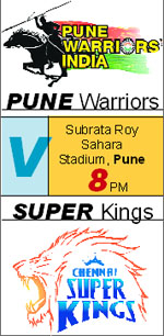 The Warriors started the tournament on a positive note, notching up wins in their first two matches, till Kings XI Punjab disturbed the momentum. The Super Kings, on the other hand, have not been their usual self at the start, but the thrilling win over Royal Challengers Bangalore yesterday when they chased down 206, should come as a shot in the arm for the visitors. True, the Subrata Roy Sahara Stadium is set to be packed to the brim by Warriors fans, but going by Chennai's depth and variety, the visitors are not likely to be too worried about that. As far as captaincy is concerned, Ganguly led the side well, but is yet to fire with the willow. Considering that they are not a side packed with experienced international stars, it is important that Ganguly takes the lead himself and inspire the rest who follow him in the batting line-up. The top-order hasn't fired yet and quicker the likes of Jesse Ryder, Robin Uthappa, Manish Pandey and Angelo Mathews get into the groove, the better it will be for the Warriors in the nine-team T20 tournament. Their batting may not seem that formidable but Pune surely have a pretty good bowling attack in Ashok Dinda, Ashish Nehra and leg-spinner Rahul Sharma.