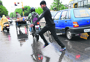 A man runs for shelter in Sector 20 as light showers hit Chandigarh on Saturday.