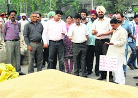 Principal Secretary, Defence Services Welfare Department, Punjab, C Raul (third from left) at the Salem Tabri grain market in Ludhiana on Tuesday. Photo: Inderjeet Verma