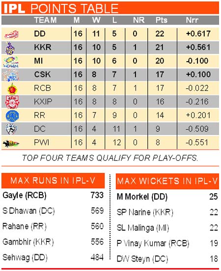 Steyn claimed the wickets of dangerous Chris Gayle and his opening partner Tillakaratne Dilshan and Zaheer Khan as RCB failed to chase down the target of 133 at the Rajiv Gandhi International Stadium at Uppal. The victory by the Chargers also meant that defending champions Chennai Super Kings go through the play-offs stage, along with table-toppers Delhi Daredevils, Kolkata Knight Riders and Mumbai Indians. RCB collected 17 points from 16 matches, the same as that of Chennai but the latter made it to the play-offs stage on better net run rate. Delhi now play Kolkata in the first qualifier in Pune on May 22 while Chennai take on Mumbai in the eliminator in Bangalore on May 23. The Chargers, who ended the tournament at eighth out of nine teams with nine pints from 16 matches, thus spoiled RCB's chances of a play-off berth just two days after knocking out Rajasthan Royals from the tournament. Steyn was ably supported by Ashish Reddy (3/25), Amit Mishra (2/26) and Veer Pratap Singh (1/26) as RCB could score 123 for nine from their 20 overs. But RCB's run chase never got going as they lost wickets at the crucial stages. Gayle taking 24 runs from the second over bowled by Manpreet Gony was the only highlight of the RCB chase and all the batsmen other than Kohli, Gayle and Tiwary could not reach double digits. It was a perfect revenge for the Chargers who were earlier beaten by the same opponents. But, just as the RCB run chase began it looked like they would run away with the destructive Gayle hitting Gony two sixes and three fours from the second over. It was, however, not Gayle's day today as he lost the duel with Steyn. Gayle tried to smash the ball through the off-side but took the bottom edge on to his stumps. The South African fast bowler then picked up the wicket of Sri Lankan opener Tillakaratne Dilshan by getting him LBW for just four runs. Mishra gave a double blow to the visitors in the 10th over by dismissing AB de Villiers (4) — when compatriot J P Duminy took a splendid catch — and then bowled Mayank Agarwal for just one run. Kohli and left-hander Tiwary tried to steady the innings and put on 46 runs, but the former's innings of 42 came to an end in the 16th over when RCB required 30 runs off 25 balls. It was medium-pacer Ashish Reddy who had the last laugh after Kohli had hit a massive six of his previous delivery. Kohli was dismissed the very next delivery when he tried to replicate the shot and the ball went straight at long-on for Gony to take a fine catch. Kohli hit two fours and as many sixes. With 29 runs required for a win by RCB, Steyn removed Zaheer Khan in the 17th over before Veer Pratap Singh claimed the wicket of Tiwary who made 30 off 27 deliveries. Fourteen runs were required of the last over and Ashish Reddy dismissed Vinay Kumar and Muttiah Muralitharan as RCB ended their innings at 123 for nine. Earlier, South African allrounder JP Duminy cracked a strokeful 53-ball 74 as Deccan Chargers recovered from a shaky start to post a modest 132 for seven.