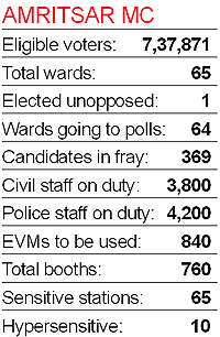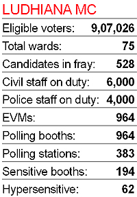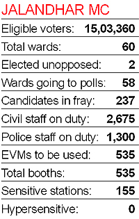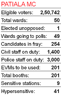 The previous MC elections were marred by violence and booth capturing allegedly by supporters of the SAD-BJP alliance. The Congress had even announced to withdraw from the elections. This time, Congress leaders have been maintaining that the police is terrorising party nominees and the elections would be a repeat of the 2007 poll. For 50 municipal wards, as many as 2,50,742 (1,31,498 men, 1,19,244 women) voters will cast their vote. A total of 254 candidates are in the fray. Some of the prominent candidates are Ajit Pal Singh Kohli, Harinderpal Singh Tohra, Harpal Juneja, Anil Bajaj and Amarinder Bajaj. Akali candidate from Ward No. 39 Jaspal Pradhan has already been elected unopposed. (Inputs by Aman