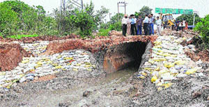 MC officials visit the site where the pipeline is damaged in Sector 53, Chandigarh, on Saturday. Tribune photo: Parvesh Chauhan