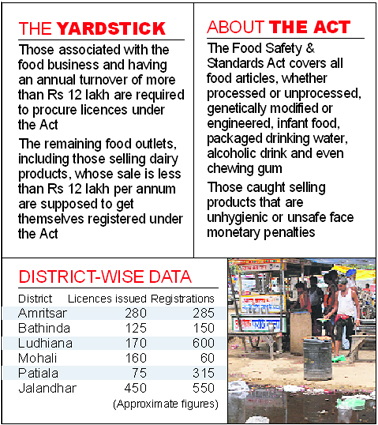 Those associated with the food business and an annual turnover of more than Rs 12 lakh are required to procure licences under the Act. The remaining food outlets, including those selling dairy products and whose sale is less than Rs 12 lakh a year, are supposed to get themselves registered under the Act. Only a 125-odd licences have been issued in Bathinda, 75 in Gurdaspur, 70 in Ropar, 100 in Kapurthala, 170 in Ludhiana, 75 in Patiala district, 280 in Amritsar, 310 in Ferozepur, 350 in Hoshiarpur and 450 in Jalandhar. The registrations count stands at: Mohali (60), Bathinda (150), Amritsar (285), Hoshiarpur (485), Ludhiana (600) and Ropar (700). The Act covers all food articles, whether processed or unprocessed, genetically modified or engineered, infant food, packaged drinking water, alcoholic drink and even chewing gum. Those selling products found unhygienic or unsafe face monetary penalties. Health and Family Welfare Commissioner Raji P Srivastava said: "The state carried out awareness programmes on the Act with various traders' bodies and dispelled fears of exploitation at the hands of officials." Srivastava said the state would soon delegate powers to register eateries to the Local Body Department. It would also set up an appelate authority. He said 393 of the 4,331 samples gathered by health officials had failed food safety standards. It is learnt that small traders running 'karyana' stores, fearing harassment at the hands of officials, have approached Deputy Chief Minister Sukhbir Badal in the matter. |